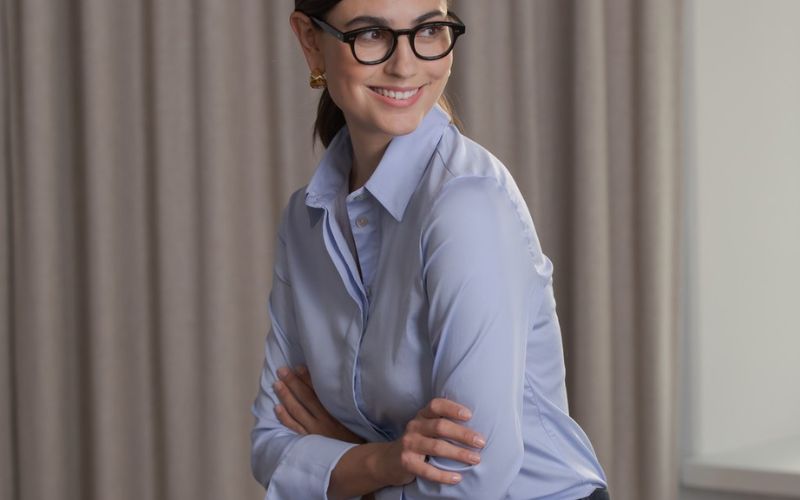 Fully buttoned with a slim pencil skirt or tailored trousers, perhaps with a subtle necklace peeking at the collar. Tuck in for maximum professionalism.
