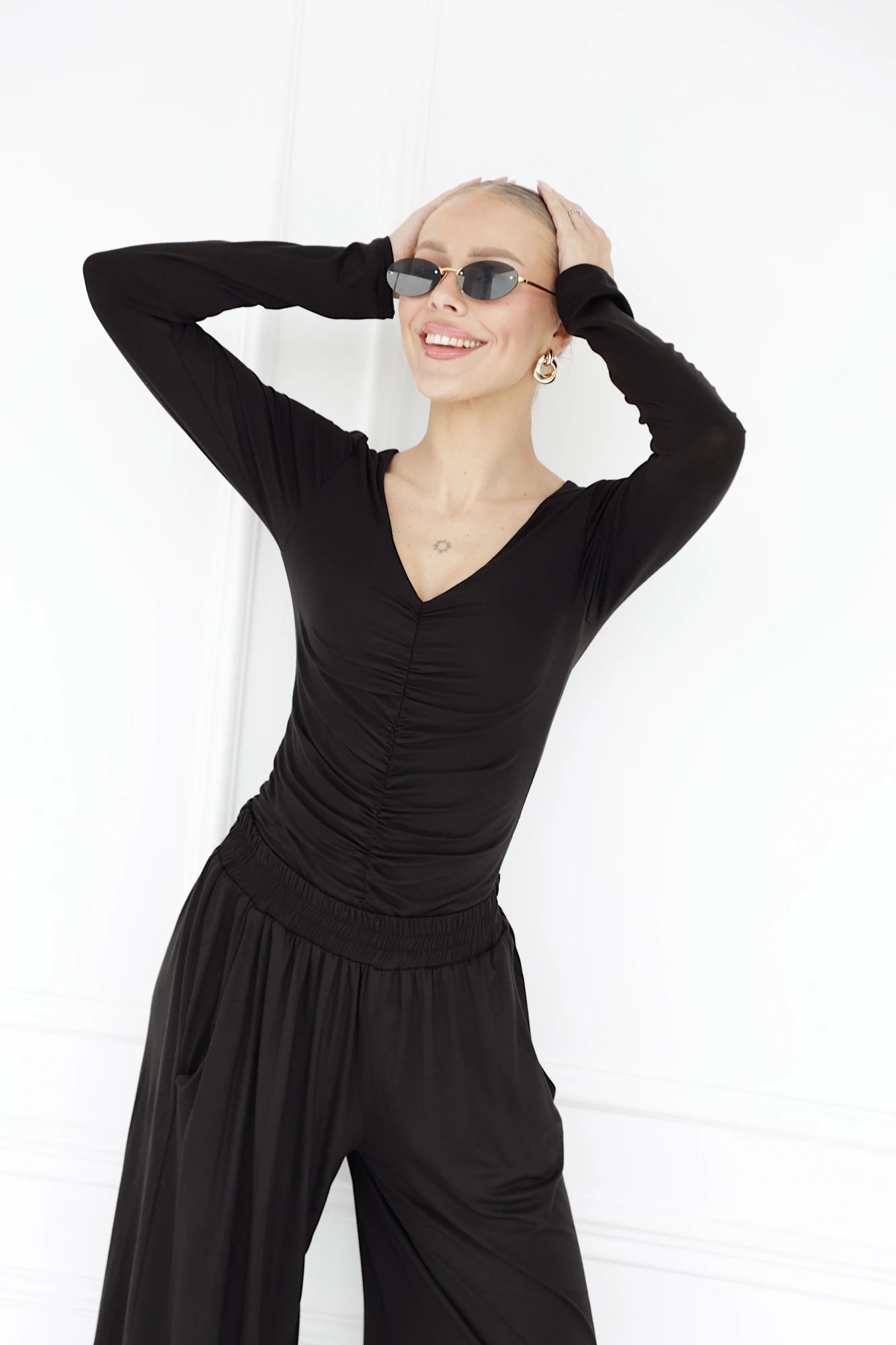 A women's bodysuit is a one-piece garment, similar in design to a swimsuit. The bodysuit has a figure-hugging fit and is form-fitting. The crotch of the bodysuit is usually fastened with buttons to make it easy to slip on. Many women prefer to wear a body instead of a normal shirt, as it is easy to combine with trousers, for example, without having to worry about the shirt's hem rising. Bodysuit stays neatly in place in any situation and gives a sophisticated look to the outfit.