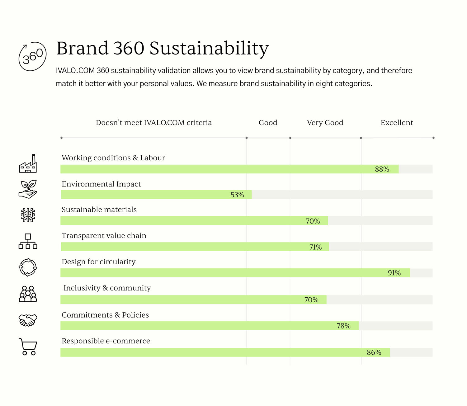 Many of us have the interest and opportunity to make value-based choices. IVALO.COM's 360 validation tells the customer which aspects of sustainability different brands emphasise in their operations and production.