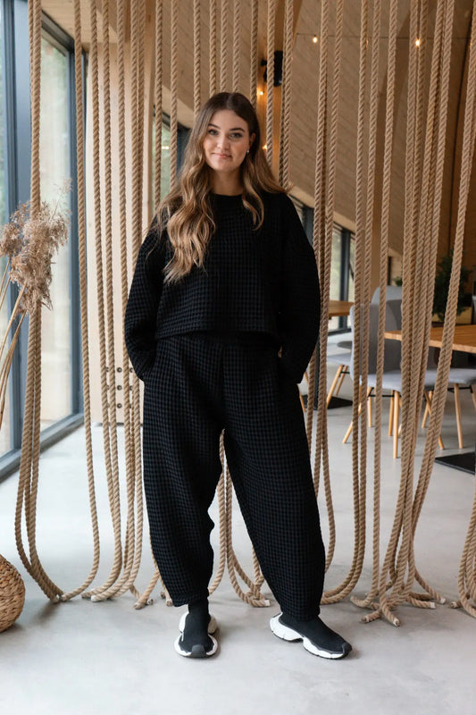 Aiko pants in carrot style, comfortable oversize pants with a slightly curved leg. Aiko pants have a wide and soft elastic waistband, and the pants also have pockets. Aiko pants are made of cotton structural honeycomb fabric and together with the Aiko sweatshirt make an ideal leisure set.