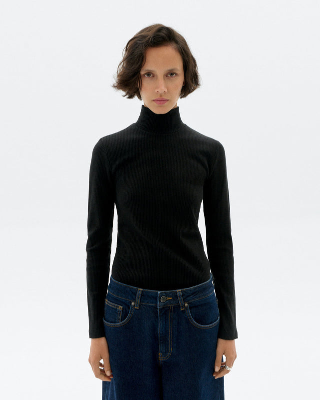The Aine Turtleneck Top in black is designed with a high neck and long sleeves, offering a slim fit silhouette tailored for a modern, refined look. Made from a thick 280 gsm ribbed fabric that combines hemp and organic cotton, it delivers excellent durability while remaining breathable and sustainable. The regular length and carefully measured proportions ensure comfortable wear and versatility. Thanks to hemp’s naturally lightweight and breathable fibers, this top provides eco-conscious performance without compromising on comfort or style.