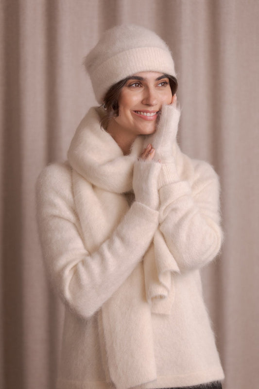 Alpaca Blend Gloves Cream offer exceptional warmth and softness thanks to their high-quality alpaca blend. These gloves provide comfortable insulation in cold weather while allowing full finger mobility, perfect for using your phone or handling keys without removing them. Their fluffy texture feels gentle on the skin, making them a practical yet luxurious accessory. Pair them with other pieces from the alpaca blend collection to complete a coordinated and stylish winter look.