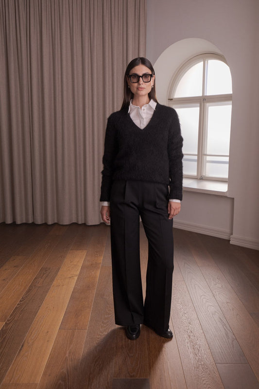 This elegant long-sleeved black alpaca blend sweater features a refined V-neck design that enhances its timeless appeal. Crafted for softness, warmth, and lightness, it offers comfortable wear throughout the day. The versatile black hue complements various outfits effortlessly, while the luxurious alpaca blend ensures a gentle touch against the skin. Ideal for both everyday wear and special occasions, this sweater combines classic style with exceptional comfort.