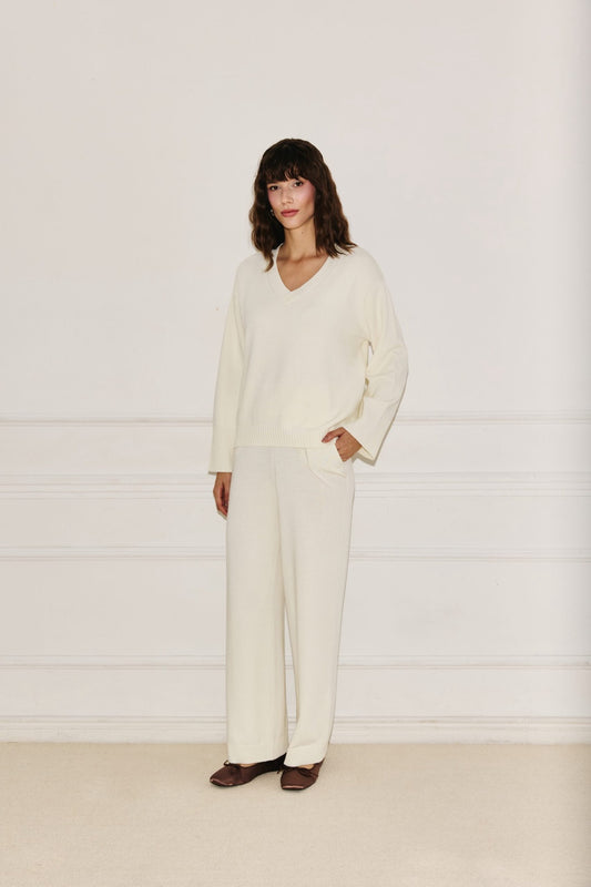 The Amelié Trousers in ecru feature a loose, wide-leg cut and an elastic waistband for comfortable, effortless wear. Crafted from lightweight viscose knitwear, they offer breathability and a relaxed fit. Designed to complement matching pieces, the trousers pair seamlessly with the Amelié boxy sweater or short-sleeved blouse, creating a cohesive and stylish knitwear set. Ideal for those seeking both comfort and sophistication in their wardrobe.