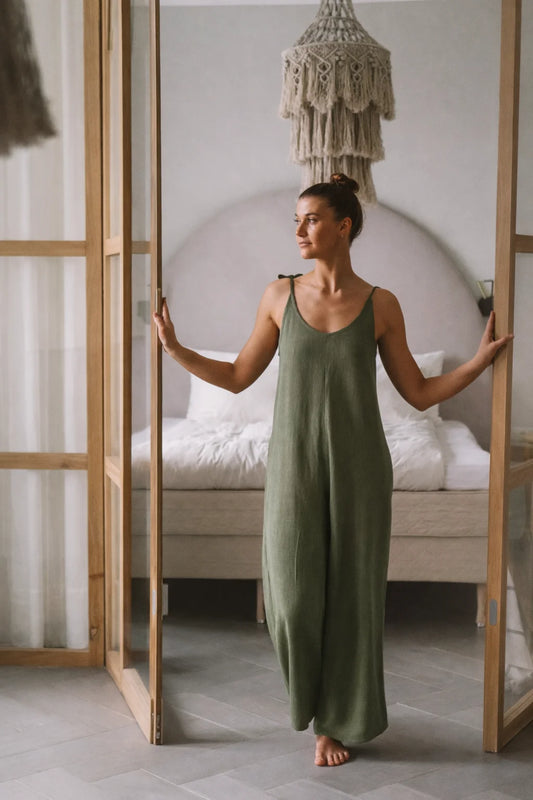 Ami Pantsuit features adjustable shoulder straps that let you customize the fit to your body—choose your preferred length, chest width, and silhouette. Wide-leg cut with functional pockets falls freely and comfortably, perfect for layering over a blouse, bikini, or lingerie, or wearing solo. The versatile design transitions seamlessly from summer walks to casual gatherings. For custom inseam length, note your preference in the order comments.