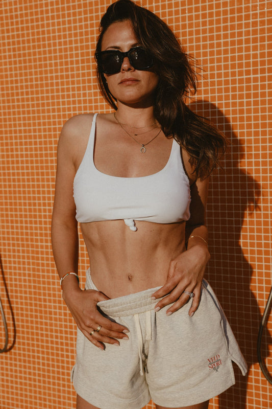 The Amstel Cropped Sweat Short is a flattering yet uber-comfortable short. The Amstel Cropped Short features a stretch waist band, adjustable drawstring, side slits, and lined pockets crafted from soft, breathable, 415 gsm Organic Cotton. Features retro tennis club inspired graphics sreenprinted on the leg.