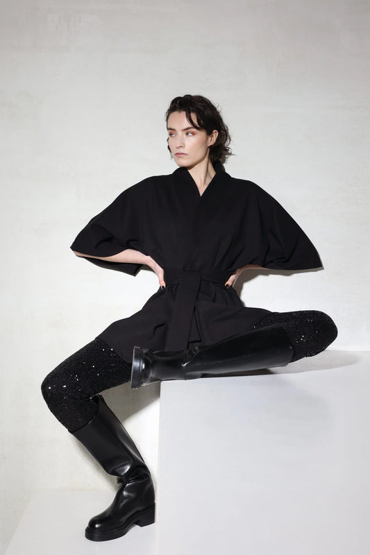 The Ava kimono jacket is a belted jacket that is longer in the front and shorter in the back and has wide kimono-style sleeves. The jacket can be worn both tied in the front and open, the belt of the jacket is attached to the side seam.