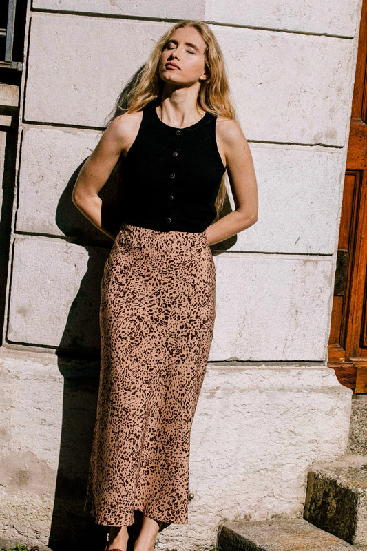 Long bias-cut satin skirt with an elastic waistband and side zip closure.