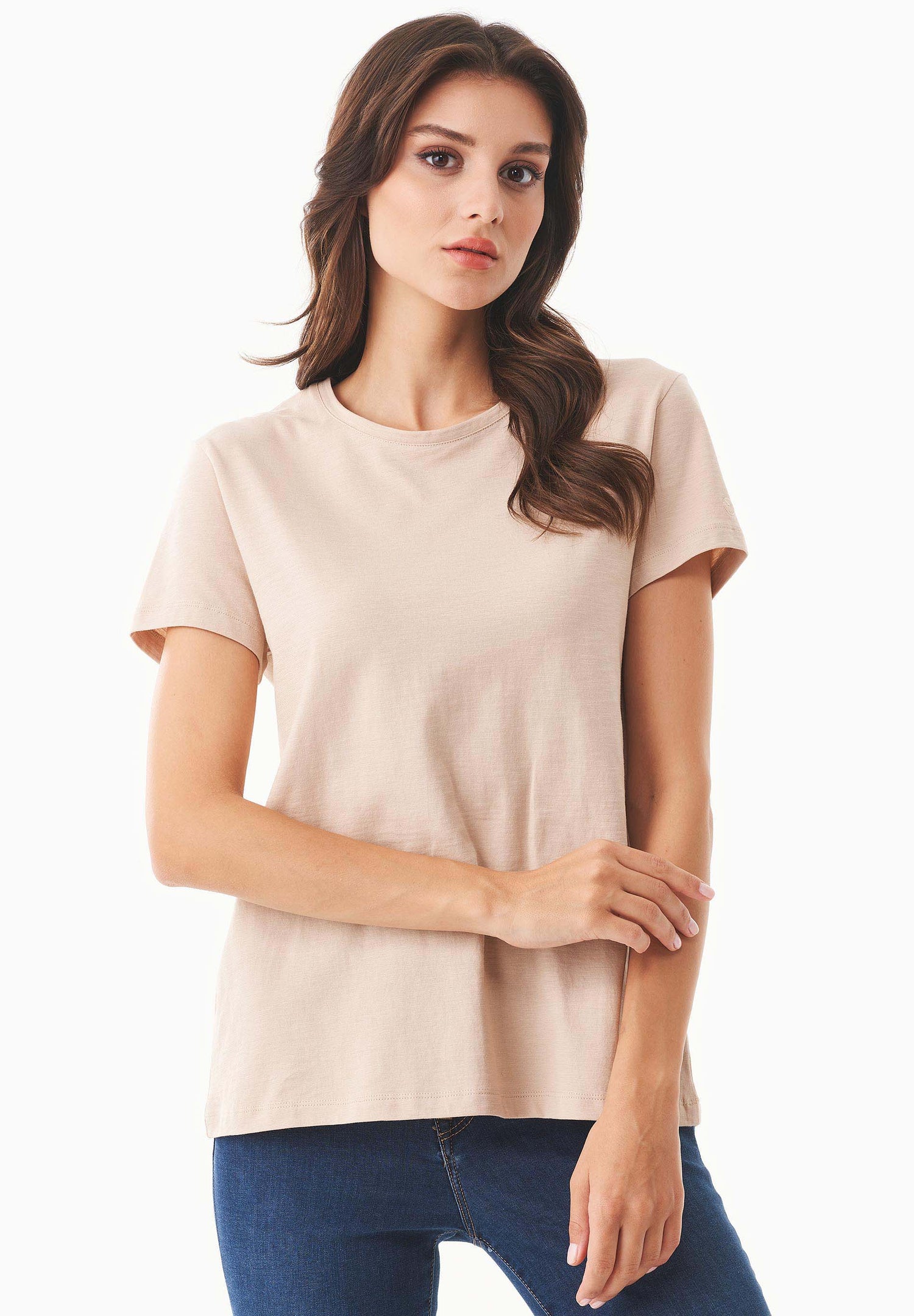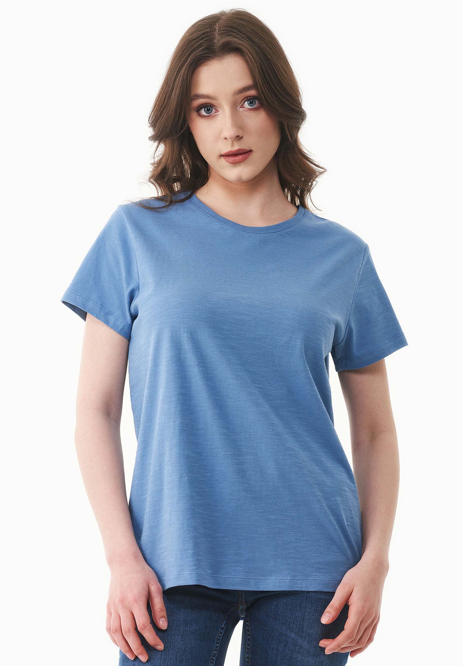 This Women's Basic Round Neck T-Shirt offers a comfortable, regular fit with a timeless design. Made from soft slub jersey fabric, it provides a textured feel that’s perfect for casual wear.