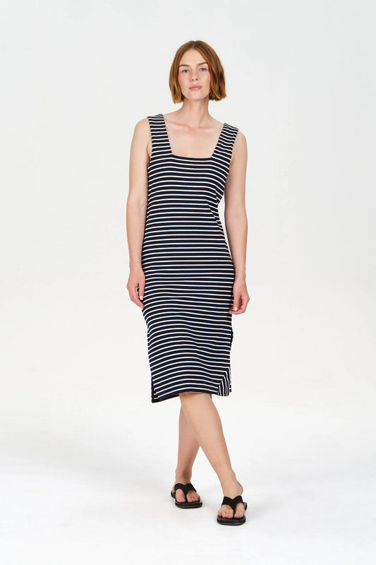 Effortless elegance in a timeless navy stripe. The dress combines breathable organic cotton with a touch of stretch for all-day comfort and movement. Perfect for layering or wearing solo.