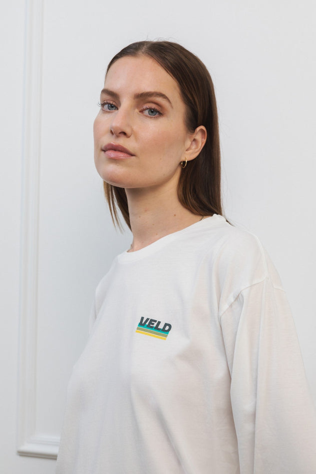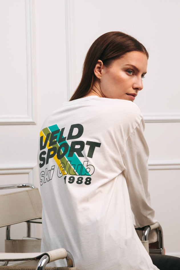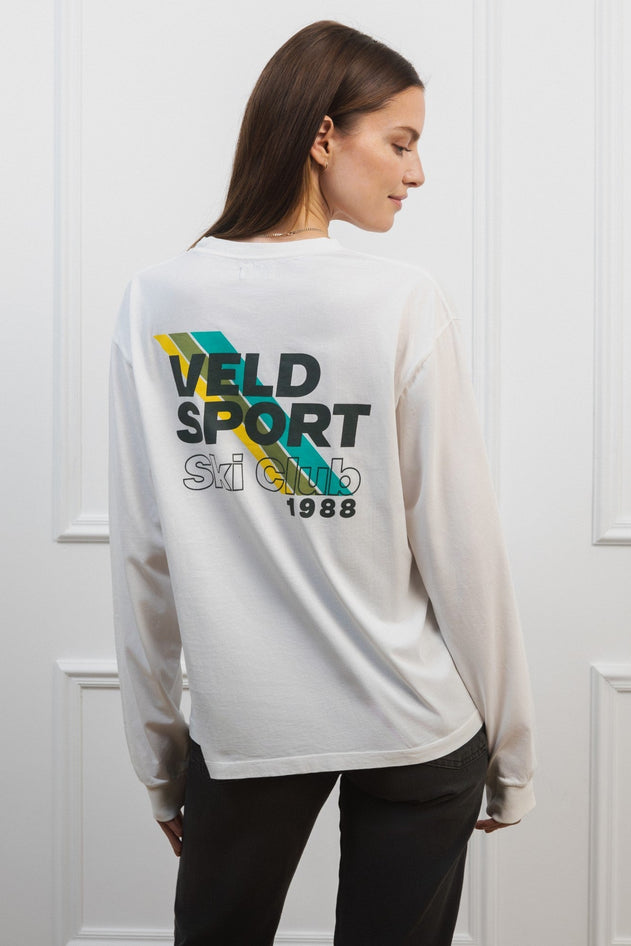 The Beverly Long Sleeve T-Shirt is a cozy and stylish top designed for wearing all year long. Crafted from 160 gsm Organic Cotton, it offers a gentle, plush feel that's lightweight but also has a good thickness. Its standout feature is the vibrant vintage ski-themed designs showcased on both the front and back.