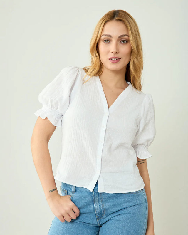 Short-sleeved white blouse crafted from 100% organic cotton plumeti muslin in a Madrid workshop. Features a soft, quilted texture with delicate embroidered details for a romantic aesthetic. Gentle on sensitive skin and versatile enough to pair with any wardrobe staple.