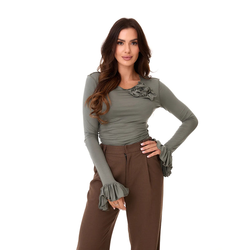 Elegant long-sleeve blouse finished with striking ruffles that compliment each other with a decorative rose on the chest. The stretchy, close-fitting fabric emphasizes and enhances feminine curves, while the crinkled fabric around the waist adds freedom and comfort, optically slimming the figure. Pleasant to the touch and subtly finished, it provides softness and delicacy.