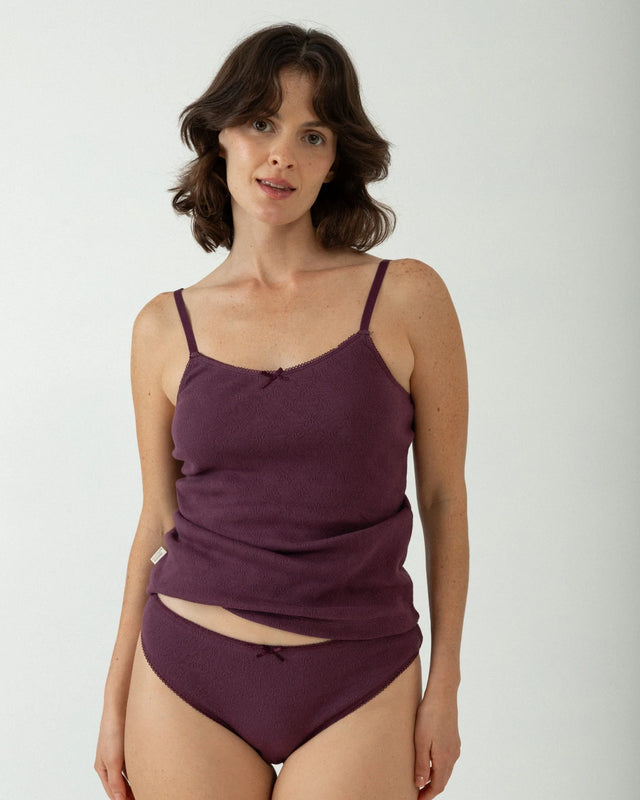 Purple undershirt with adjustable straps crafted from 100% organic cotton, featuring a romantic design with bow, decorative trim, and openwork butterfly details. Ethically manufactured in Portugal and ideal for sensitive skin.