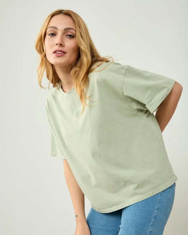 Discover effortless style with this oversized green tee from Clotsy Brand. Crafted from 100% organic cotton and finished with a delicate embroidered flower, it delivers softness and comfort in equal measure. The striking apple green hue, enhanced by a subtle stonewashed finish, owes its depth to Nano Earth technology—an innovative dyeing method that uses nano-particles to achieve superior color penetration while dramatically reducing water, dye, and energy consumption. The result is a garment with minimal environmental impact and exceptional durability. Cut with an intentionally relaxed silhouette featuring extended sleeves and dropped shoulders, this piece adapts seamlessly to layered or standalone wear. Proudly made in Portugal.