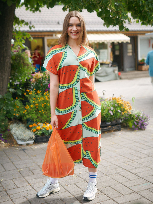 Casual straight-line jersey dress with a button-down closure and a detachable belt. The delicious red and green Watermelon pattern is perfect for summer days.