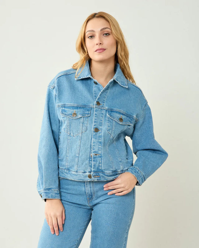 Light Denim Jacket – Pre-sale (Available March 2) Spring essential crafted from light-wash denim with contrasting yellow stitching and subtle embroidery. The bomber-cut silhouette layers effortlessly over lighter pieces when temperatures dip. Functional side pockets and copper buttons complete the design.