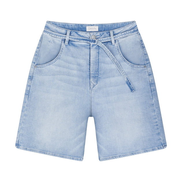 High-waisted light blue denim shorts with a wide cut. Unique rounded shape front pockets and patch pockets on the back. Darts on the back for a more tailored fit. A detachable thin matching belt comes with the shorts.