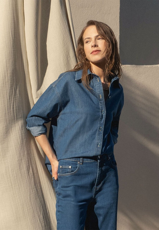 Women's denim button-up shirt in a medium blue wash. Jeanologia's eco-friendly washing process reduces its environmental footprint, and the medium blue denim fabric is versatile and ideal for a modern look. This loose fit shirt is ideal for relaxed yet stylish outfits.