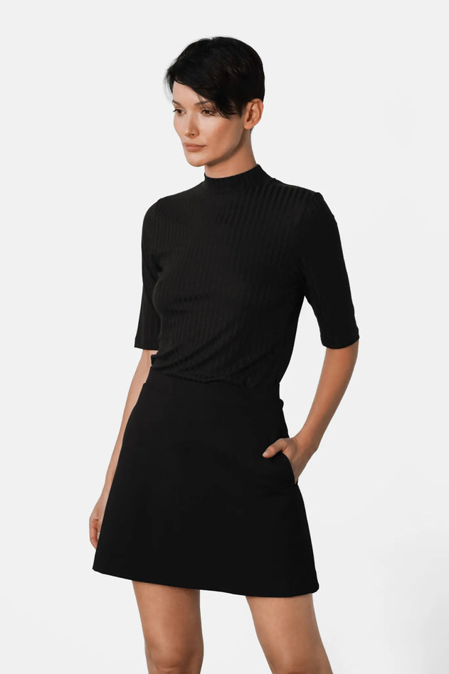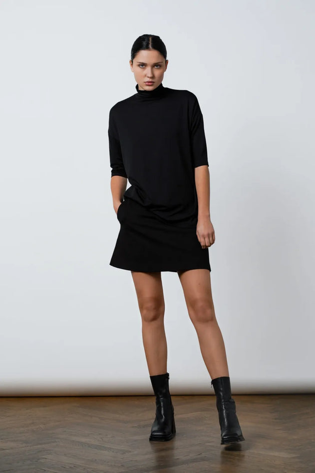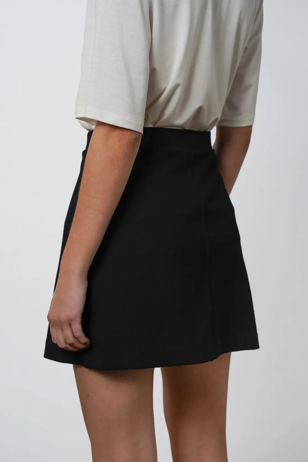 This A-line mini skirt boasts a stylish 90’s silhouette, an elastic waistband for comfortable wear, and pockets in the side seams for added convenience. Made with heavy jersey stretch quality fabric, this skirt is both durable and flexible. Its versatile design and practical style make it a perfect addition to any wardrobe, suitable for any casual occasion.