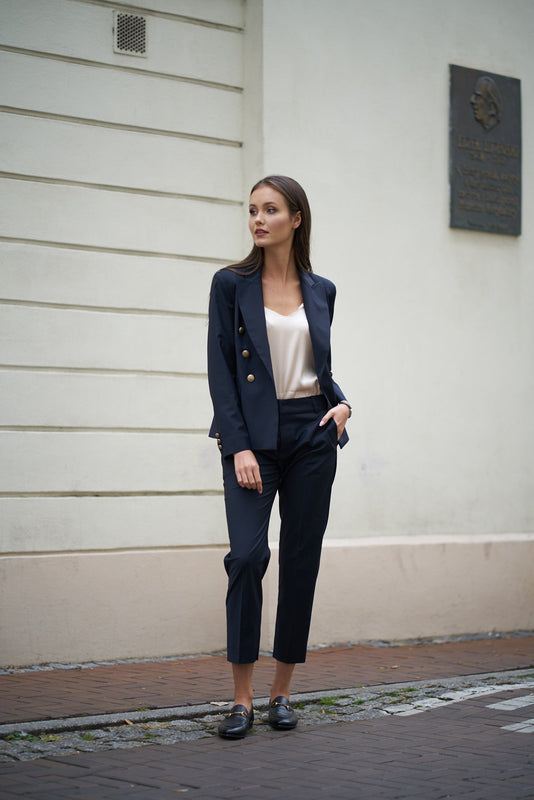 Classic navy blue cigarette pants 7/8 with a halter front zipper. The pants match with a jacket with gold buttons.