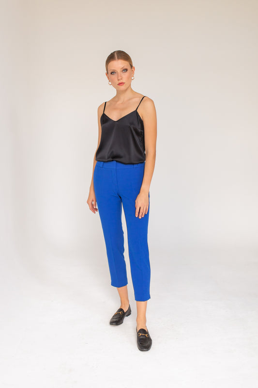 Sapphire cigarette pants are classic elegant 7/8 length pants with a front zipper. The pants have a partial elastic waistband introduced to better fit the figure; at the back of the pants, about 20cm of elastic is sewn in, which models the waist, and at the same time the pants are more comfortable. The pants match with a double-breasted sapphire jacket.