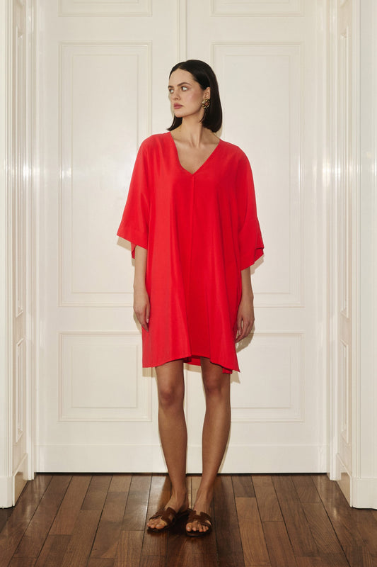 The kimono dress offers a modern and stylish twist on a classic design, presenting a shorter version of Enteliér's signature maxi dress.