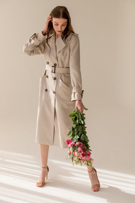 Light beige silk trench coat is a classic elegant long coat made of silk twill. The coat has a slightly looser cut, it has a tightly drawn collar and shoulder patches. The coat has a double-breasted button closure. In addition, it has a long buckle belt at the waist and buckle straps on the sleeves, which can be adjusted.