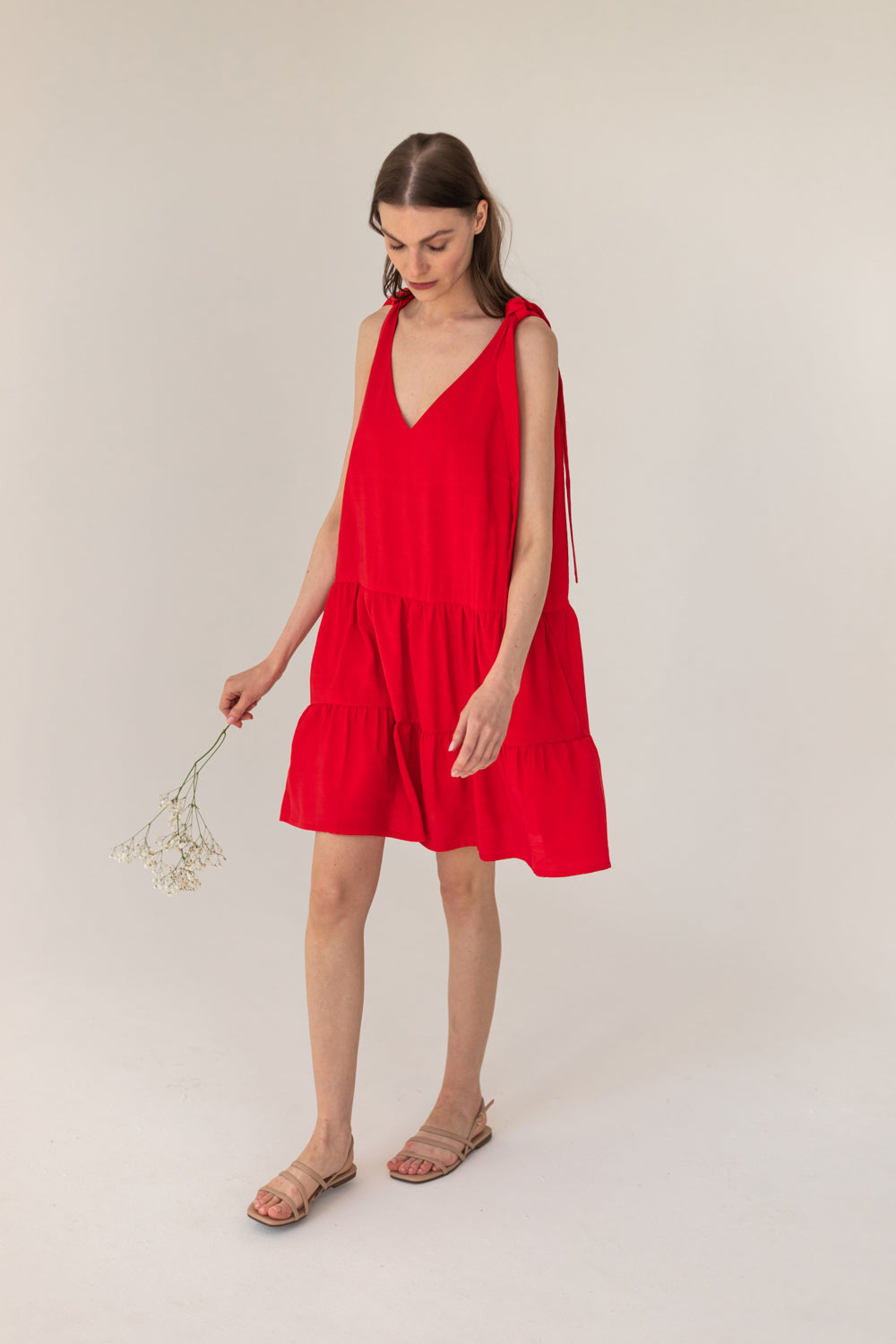 Summer blue dress knotted at the shoulders is an ideal choice for summer. The dress has a loose oversize cut, pockets in the seams. V-shaped neckline. The dress is finished at the bottom with a double ruffle, very slightly crinkled. The straps are long adjustable, they can be tied in different ways, bows or let loose. The dress is extremely comfortable and airy, made of viscose and viscose lining. The dress is also available in red, black and beige.