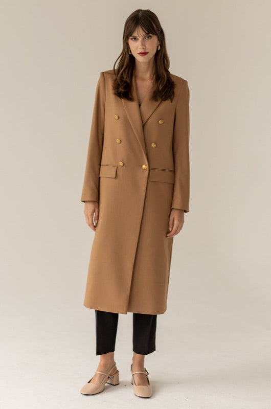 The coat is made of fleshy viscose fabric in a beautiful caramel color.