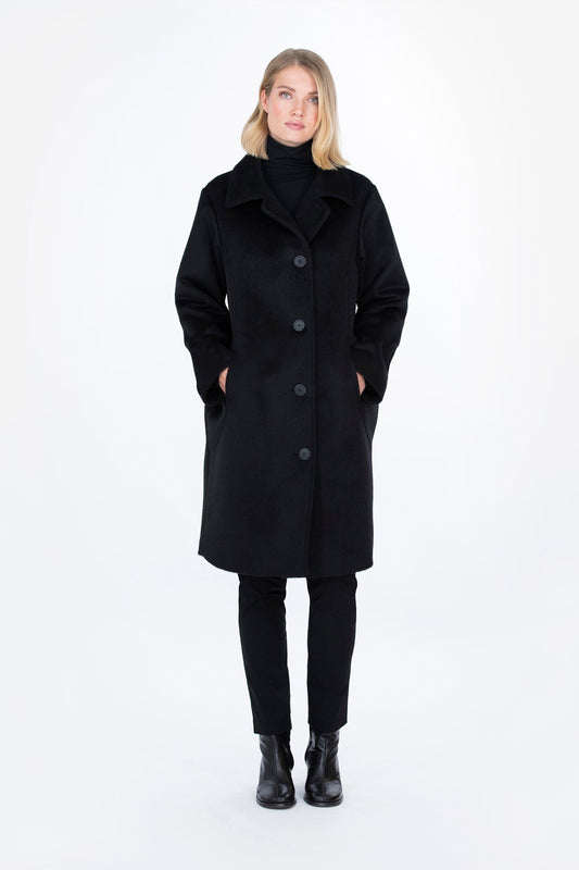 Omena wool coat is classically timeless. The straight-lined coat has curved vertical cuts on the front and back, giving it a slim look. The pockets are embedded in the cuts of the front piece. The coat has a button fastening and a lapel collar, which you can button all the way up. The coat is made of high-quality olive green Italian wool-blend fabric. The lining fabric is acetate viscose.
