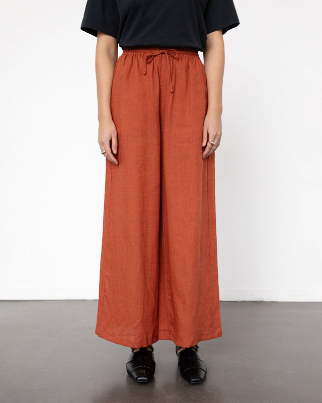 Expertly crafted and designed for comfort, the Flared Pants Dusty Red have a minimalistic style and a wide leg cut. The elastic waistband offers a perfect fit for any body type. Elevate your wardrobe with this versatile piece, perfect for any occasion.