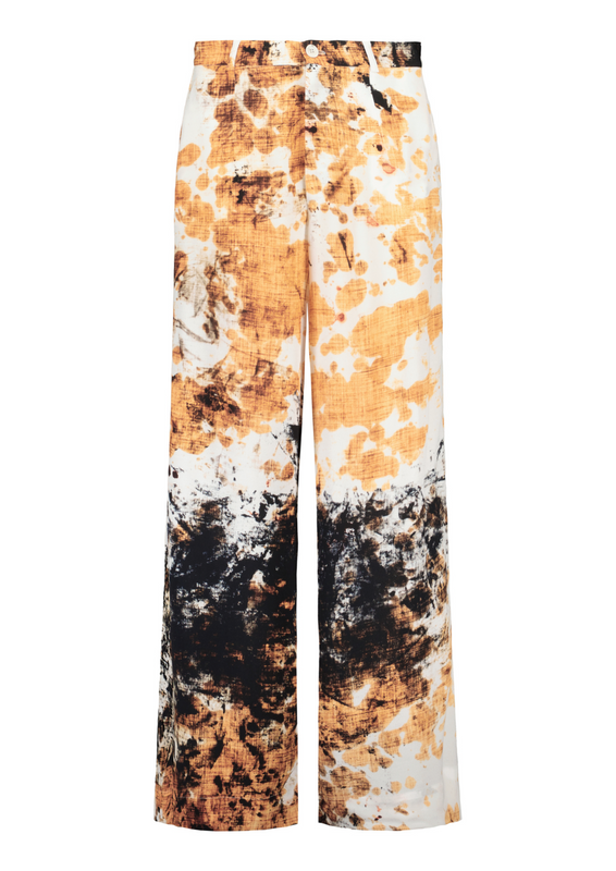 Wide-leg pants with a beautifully draping Framtiden pattern. Made from 100% EcoVero, a comfortable material that is breathable and structured. The full-length, straight wide leg moves gracefully as you walk. The waistband features belt loops, back darts, and an elastic band for added room. The pants have a zipper and button closure.