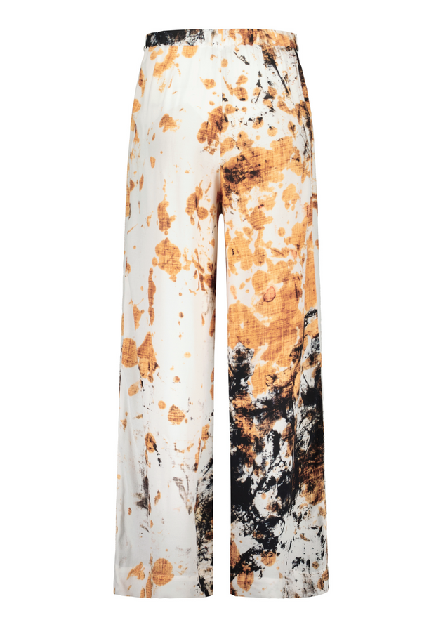 Wide-leg pants with a beautifully draping Framtiden pattern. Made from 100% EcoVero, a comfortable material that is breathable and structured. The full-length, straight wide leg moves gracefully as you walk. The waistband features belt loops, back darts, and an elastic band for added room. The pants have a zipper and button closure.