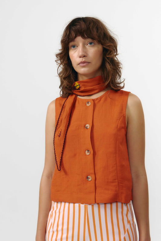 2 in 1 sleeveless top, featuring round neck. Closed with corozo nut buttons, it can be worn on both sides. The fabric feels light on the skin and easy to move in. An easy option you’ll probably wear more than planned.