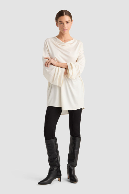 The Gennova Top Paper White features a graceful, elongated design highlighted by a softly draped cowl neck that enriches your ensemble with subtle sophistication. Its long, relaxed sleeves deliver comfort and freedom of movement, complemented by a rounded hem that offers a contemporary, flattering edge. This top is crafted to embody refined, effortless style