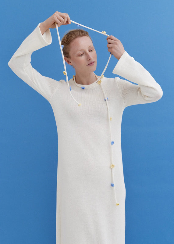 This handcrafted necklace features delicate crocheted flowers made from 100% ZERO® cotton, a yarn produced with lower-impact dyeing and spinning processes. Made to order in small batches, each piece is individually knitted by hand within 4–5 days, then sewn and finished. This approach reduces overproduction and relies on manual techniques rather than industrial machinery.