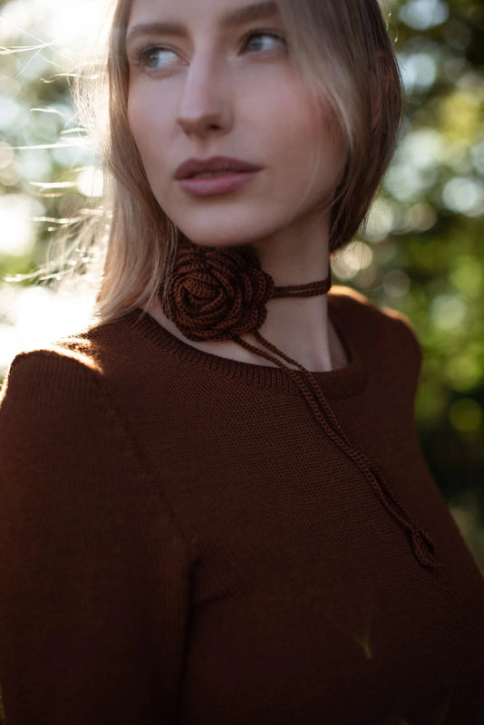 Handcrafted merino wool rose necklace in deep black. Soft, warm, and uniquely designed to elevate any outfit with timeless floral elegance.