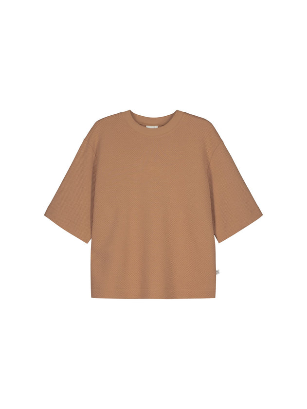 This Honeycomb T-shirt in Nougat offers a loose, unisex fit designed for comfort and versatility. Crafted from 100% organic cotton with GOTS certification, it ensures both quality and sustainability. The structured material maintains shape and durability, while the sizing follows a double size rule, corresponding to the larger size for ease of selection. Ideal for those seeking an eco-conscious wardrobe essential with a refined, expert touch.