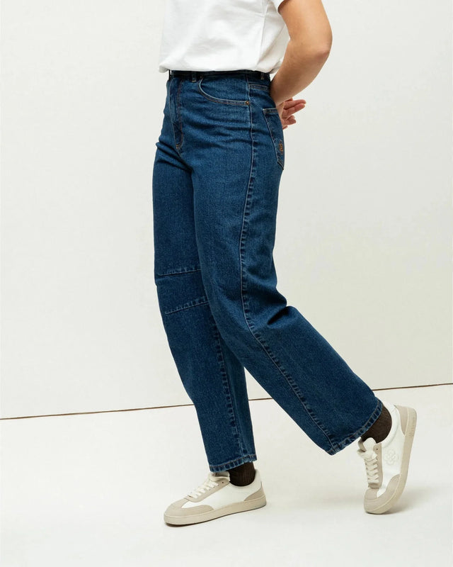 Barrel-cut jeans with a curved silhouette that fits snugly at the waist and ankles while offering generous volume through the hips and thighs. High-waisted design for a flattering fit.