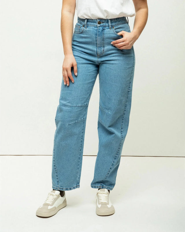 Barrel-cut jeans with a curved silhouette that fits snugly at the waist and ankles while offering generous volume through the hips and thighs. High-waisted design balances structure with comfort.