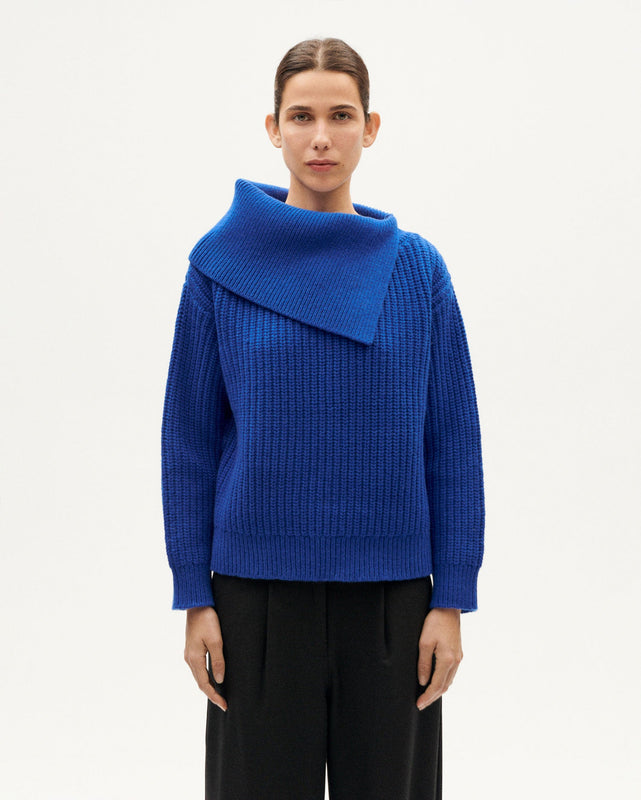 The Sua blue wool sweater combines timeless design with comfortable wear. Featuring a classic turn-down collar and long sleeves, its oversize fit offers relaxed layering without sacrificing style. The sweater’s shorter length provides a modern silhouette, making it a versatile piece for both casual and refined outfits. Crafted from soft wool, it ensures warmth and breathability throughout the day.