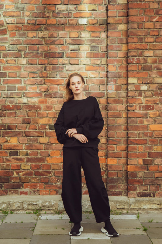 Jone pants are carrot cut, comfortable oversize pants with a slightly curved leg. Jone pants have a wide and soft elastic waistband, and the pants also have pockets. The fabric of Jone pants is not a so-called. ordinary, classic sweatshirt fabric, we have been looking for this fabric for over a year and have done dozens of different tests, but only now can we say that we have found the right (admittedly significantly more expensive than planned) fabric and we are 100% satisfied with the result. The pants form an ideal leisure set together with the Jone sweatshirt.