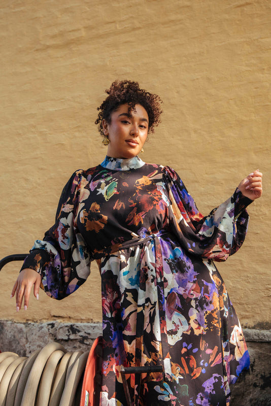 The Puff Dress Black Anemone combines elegance and sustainability, crafted from silky-soft EcoVero™ viscose. Its flattering A-line silhouette features voluminous sleeves with smocked cuffs and a refined stand-up collar with covered buttons and a subtle back slit. The included loose belt allows effortless waist definition. The dress showcases a black base adorned with large watercolor floral patterns, creating a timeless look suitable for diverse settings—from formal events to casual office days when paired with jeans. A versatile, responsibly made choice for the modern wardrobe.