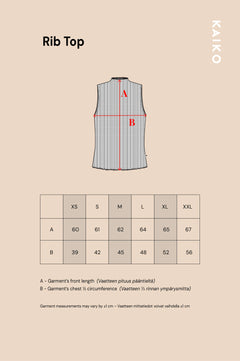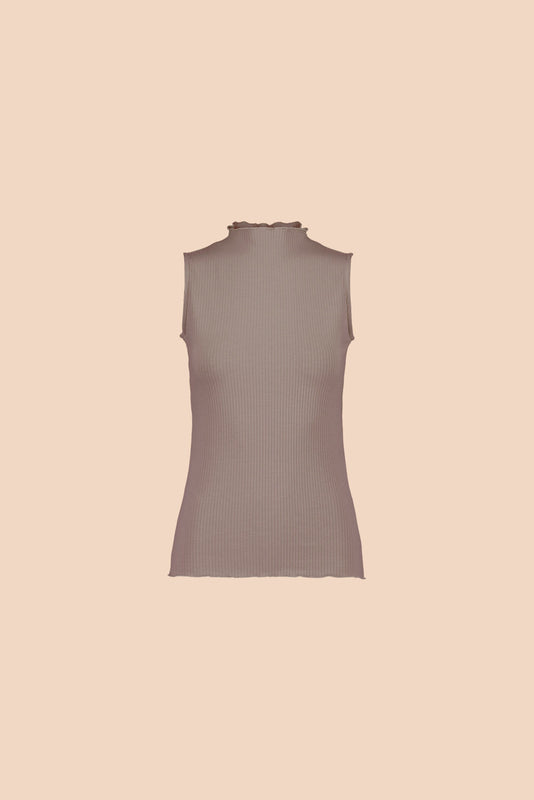 Rib Top is a stylish sleeveless ribbed knit top with an elegant turtle neck. The neckline and hem are finished with a ruffle, creating a beautiful detail to the classic top. The knit is a smooth and well draping material with a luxurious feel. The ribbed top works both on its own and worn under a cardigan, kimono or dress.
