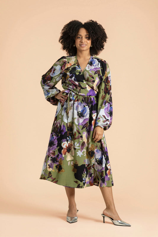 This elegant Wrap Midi Dress in Olive Anemone features a timeless silhouette paired with a modern print. Crafted from responsibly sourced, beautifully draping woven EcoVero™ viscose crepe, it offers exceptional comfort against the skin. Its versatile design suits both everyday wear and special occasions, with a flattering wrap cut and adjustable waist tie ensuring a perfect fit for all body types. Full-length sleeves with gathered elastic cuffs and softly pleated shoulders add refined volume, while the hem falls gracefully to mid-calf. Designed to last, this high-quality dress combines sustainability with enduring style.