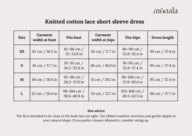 Effortlessly feminine and timelessly elegant knitted cotton dress. This dress pairs a softly fitted bodice with a flowing A-line silhouette and fine lace-inspired knitwork at the neckline and hem – every detail has been designed to celebrate quiet beauty and everyday comfort.