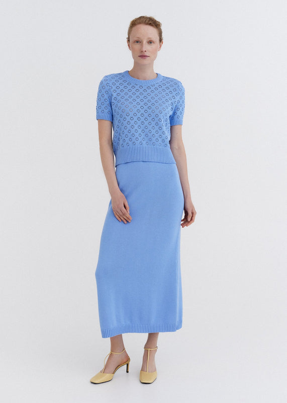 Knitted set including a light blue short sleeved lace top and a maxi skirt. Crafted from low-impact ZERO® cotton – it’s soft, natural, and feels light on the body and gentle on the skin.