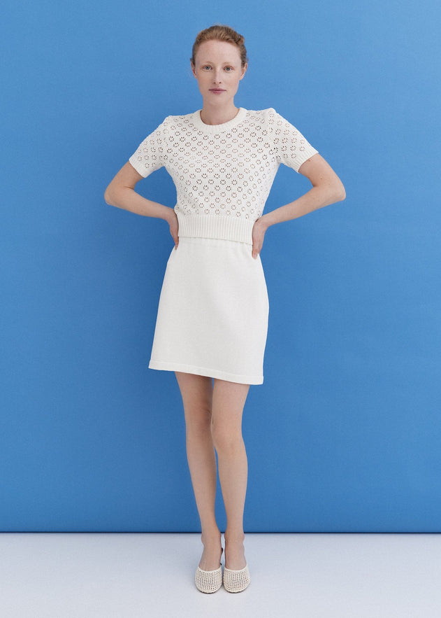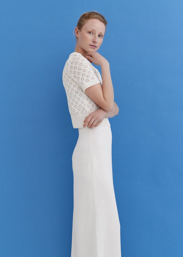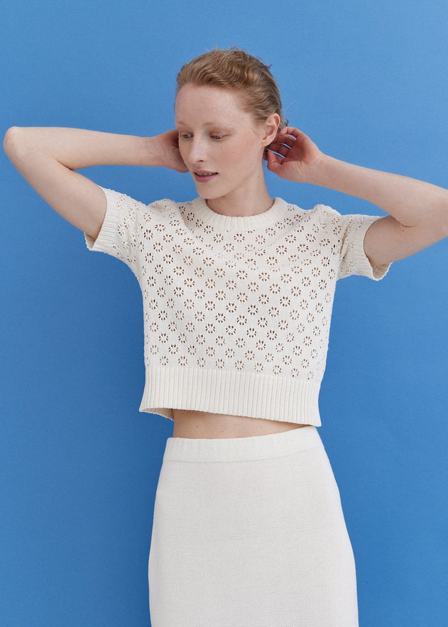 Crafted with intention and detail, this knitted cotton top brings together structure and softness in one piece. The lace-inspired texture adds lightness and character, creating a delicate open-knit pattern that lets the skin breathe and the yarn speak for itself. The ribbed trims give shape to the airy knit, while the short sleeves and crew neck keep it simple and wearable.