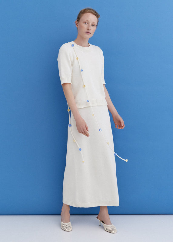 Knitted set including a white short sleeved top and a maxi skirt. Crafted from low-impact ZERO® cotton – it’s soft, natural, and feels light on the body and gentle on the skin.